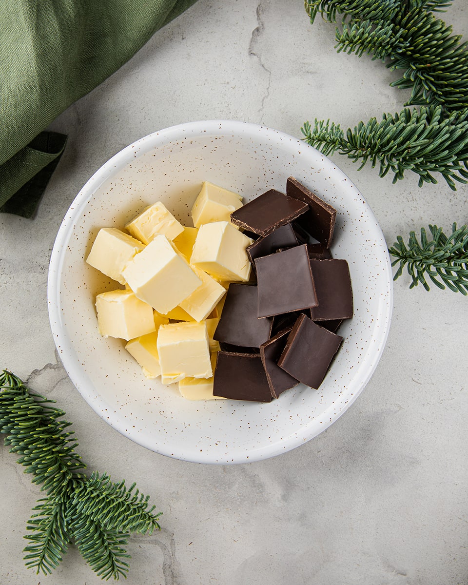 Духовку разогреть до 150°C. Масло порезать на кубики. Шоколад поломать на маленькие кусочки. Растопить вместе на медленном огне. Хорошо перемешать.