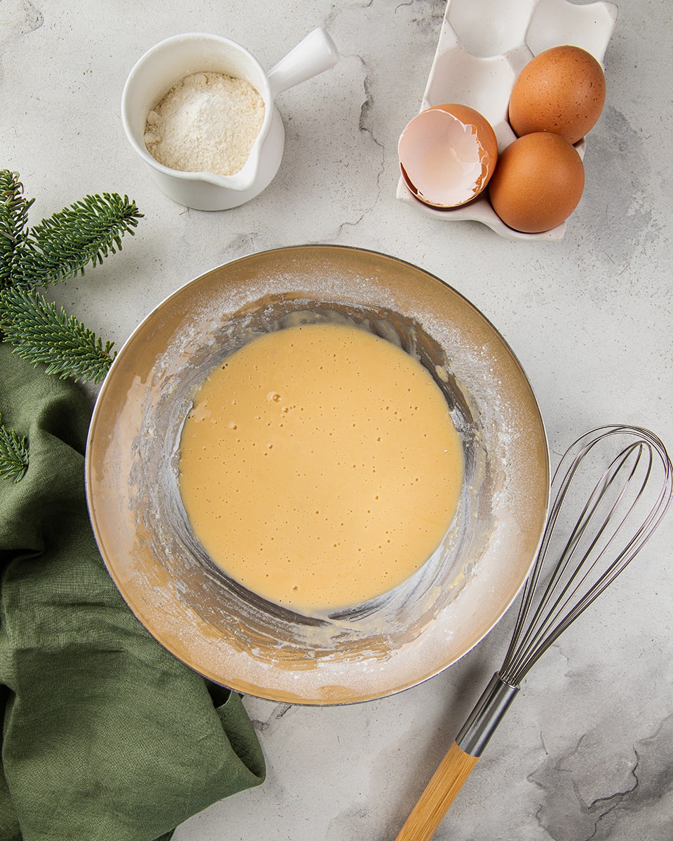 Яйца взбить с мукой. Добавить шоколадно-масляную смесь в тесто. Ещё раз хорошо взбить.