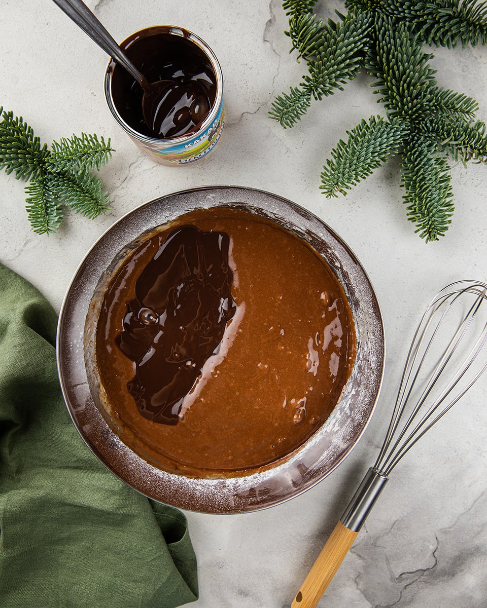 Добавить сгущённое молоко с какао. Тщательно перемешать.