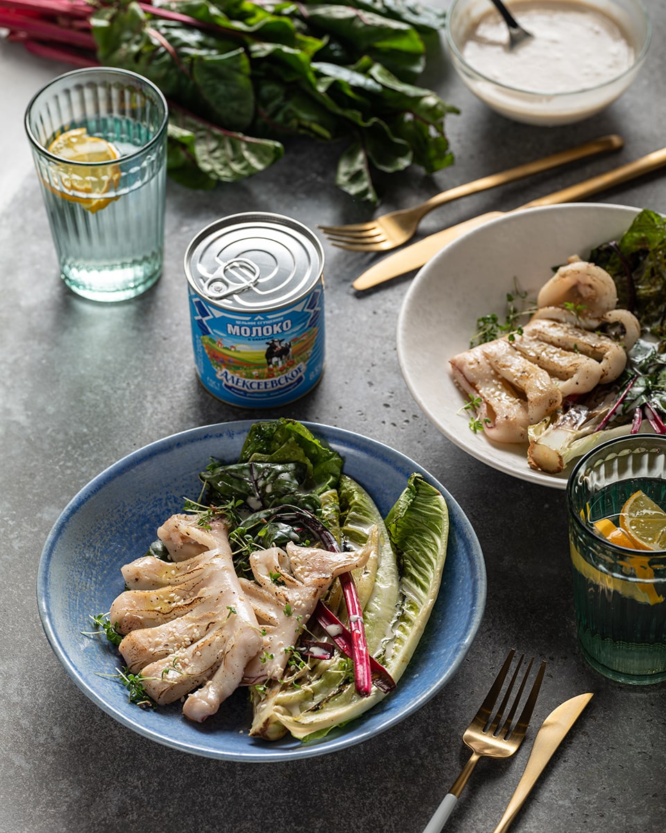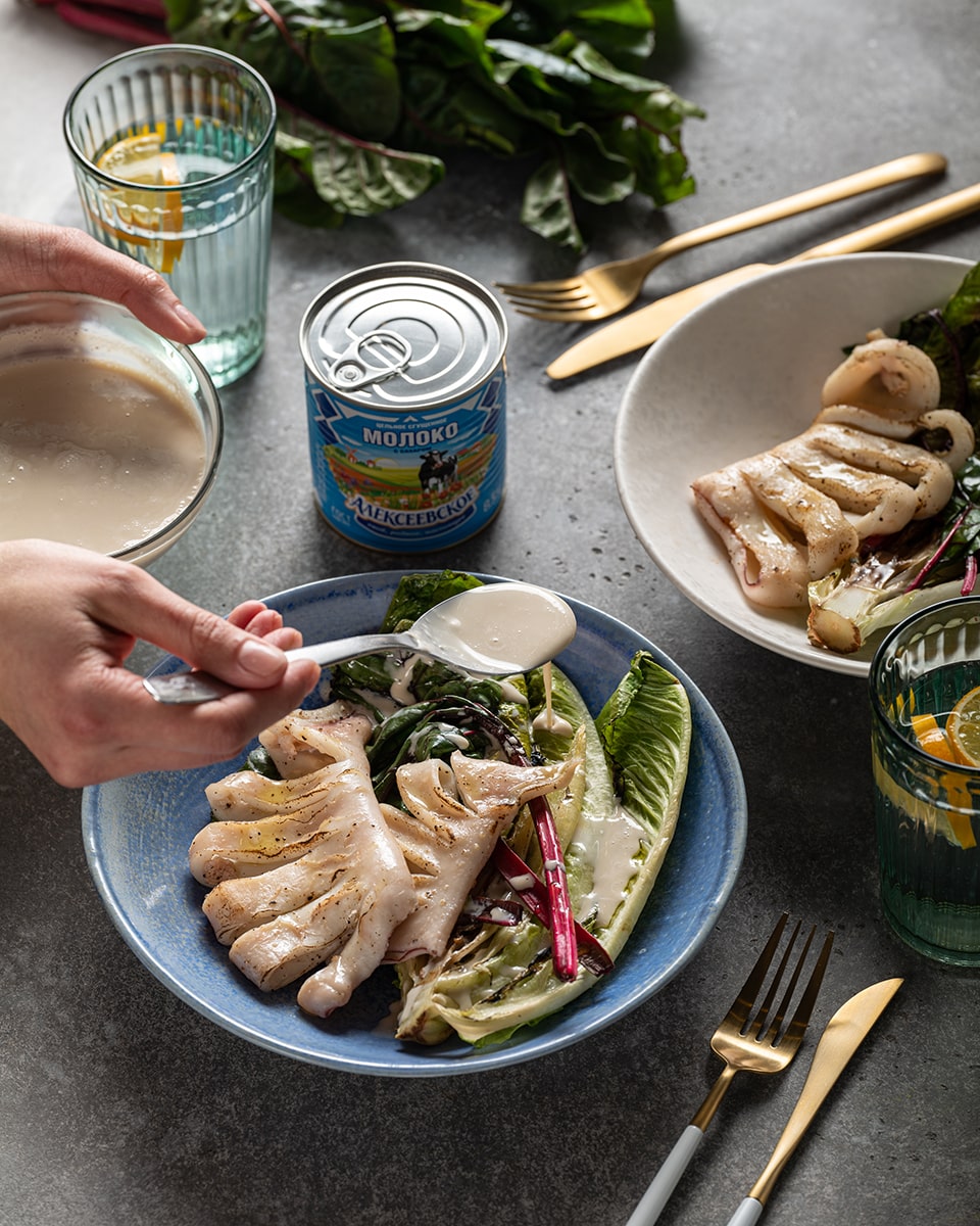 Жареный кальмар с соусом из сгущенного молока