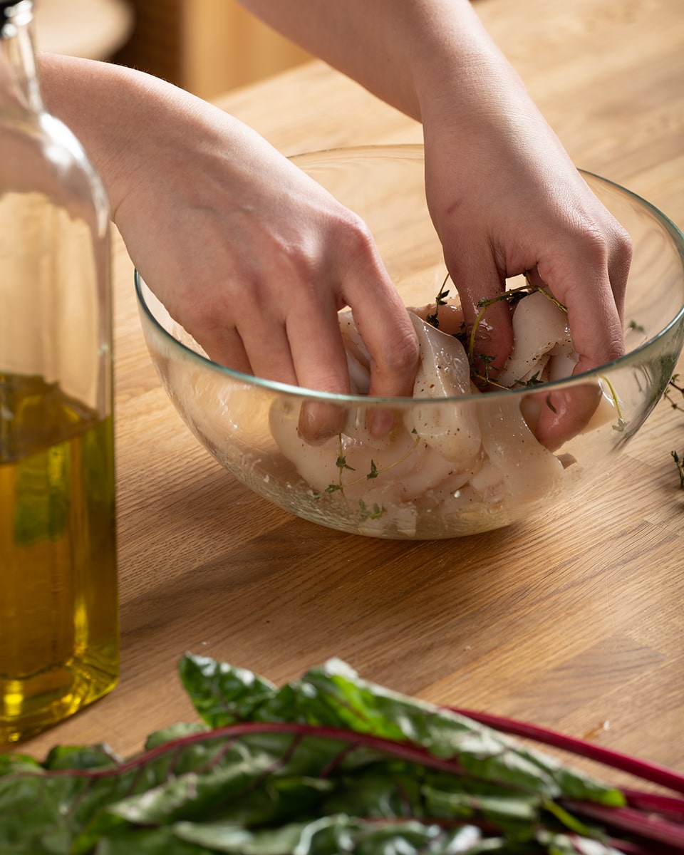Тушку кальмара промыть под проточной водой, обсушить салфетками. Сделать надрезы поперек тушки (не дорезая до конца), чтобы получился “веер”. Выложить подготовленные тушки в миску, полить маслом. Добавить листики тимьяна, ломтики чеснока, соль и перца. Немного помять руками, чтобы специи распределились равномерно. Оставить на 30 минут.